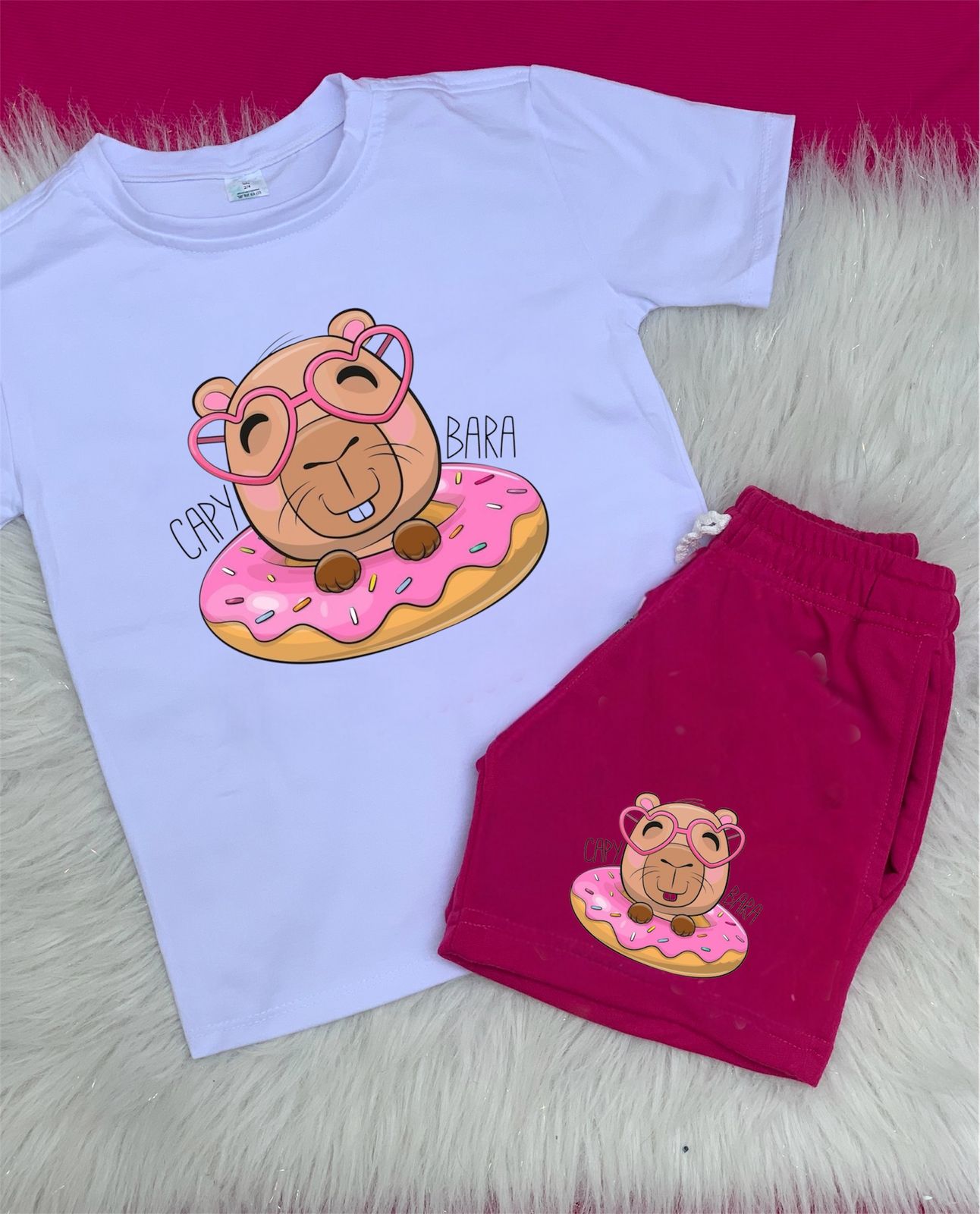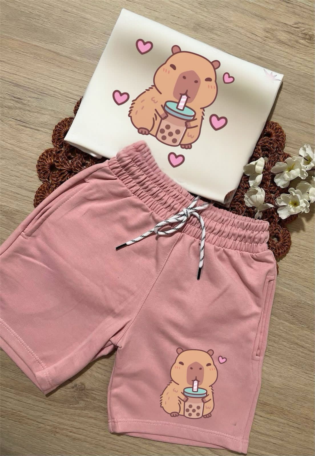 💡 Diseño Inteligente: Elástico ajustable en la cintura (crece con ellas, sin apretar). Set Completo: Camiseta + bermuda + detalle de capibara bordado.